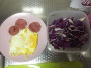 不粘锅无油煎蛋➕煎肠,紫甘蓝切丝沥干水分