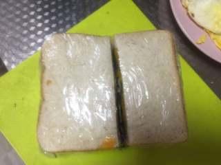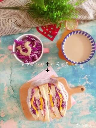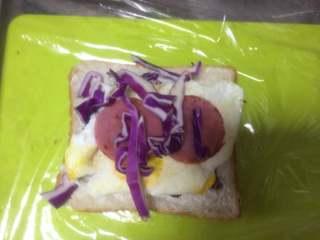 铺上保鲜膜放上一片面包,沙拉酱,紫甘蓝,煎蛋,煎肠,面包片,沙拉酱,紫甘蓝,煎蛋,煎肠,最后一层涂抹沙拉酱的面包片