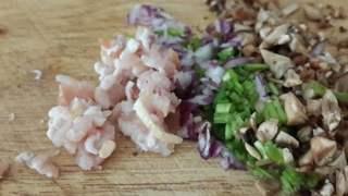 洋葱培根,欧芹,蘑菇根切碎,加盐和胡椒粉,少许橄榄油
