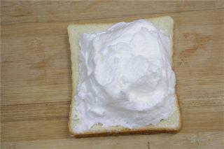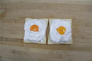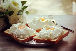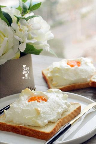 “云朵吐司 新的一天来一份养眼的营养早餐,心情都是美美哒!白白的云朵中承载着流心蛋黄,一口咬下去蛋黄在嘴里流荡,无法形容的满足感......这样一款简简单单的早餐,给你带来一天的满满能量。”