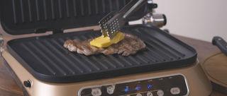 稍微煎一下后,打开牛排机放入一小块黄油