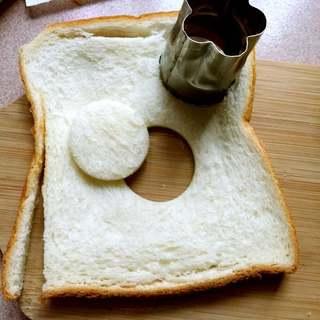 将另一片面包,用圆形小模具压出两个小圆片。