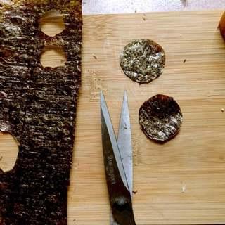 紫菜用剪刀剪出两个大一点的做眼睛,再剪出两个小一号的做爪子。