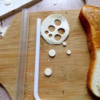 用粗、细两种吸管在面包上各压出两个大小不一的小圆片。(面包可用擀面杖擀薄再来压出圆片)