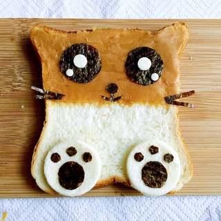 先将两个大一点的紫菜贴上两端做眼睛,下端再贴上两个面包小圆片做爪子。